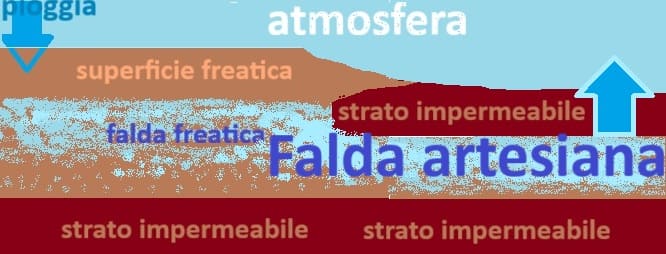 Le falde artesiane sono falde in pressione, sono alimentate dalle precipitazioni come nella falda freatica appena vista, ma il terreno che contiene la falda è circondato sopra e sotto da terreno impermeabile. La falda in pressione vince la pressione atmosferica e risale in superficie. La zona di ricarica delle artesiane può trovarsi anche a grande distanza, sicuramente la artesiana si trova più a valle della ricarica.