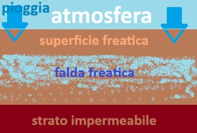 L’acqua piovana si infiltra nel terreno dalla superficie, formando la falda freatica.