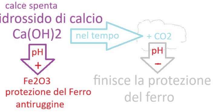 La calce spenta crea un ambiente basico che protegge il ferro. La protezione è data da un film di ossido ferrico Fe2O3 impermeabile all’acqua e alla CO2 che impedisce la formazione di ruggine in presenza di H2O ed O2.