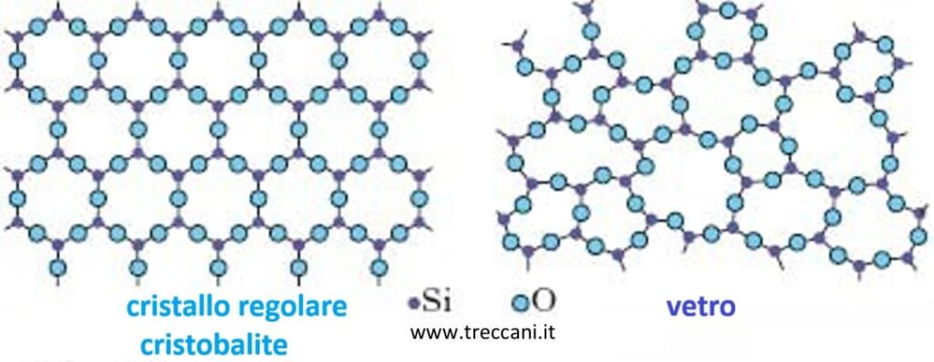La materia prima del vetro artificiale è la sabbia di quarzo, cioè silice SiO2, cristallizza in tetraedri regolari.