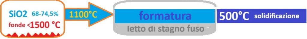 La miscela silicea esce dal forno allo stato fuso di 1.100°C, diventa vetro scorrendo-galleggiando (float) su un letto di stagno fuso, in cui il vetro diventa perfettamente piano. La miscela fusa incomincia a diventare rigida a 600-500°C. Si ottengono lastre spesse 1-24 mm.