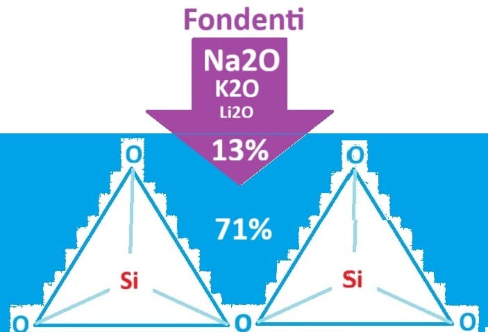 La fusione del silicato avviene a 1720°C, per abbassare il punto di fusione si aggiungono ossidi dei metalli alcalini: 13% di ossido di sodio Na2O, che si può sostituire in tutto o in parte con l’ossido di potassio K2O, e l’ossido di litio Li2O. Quest’ultimo va in piccole quantità, perché devetrifica. A 1.300-1.500 il vetro fonde, ma si tende a portarlo a 1.550 per rendere la massa vetrosa più omogenea.