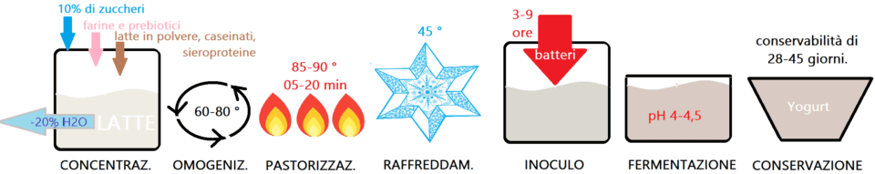 Il latte arrivato nello stabilimento viene depurato fisicamente per filtrazione e centrifugazione, oppure si parte dal Il latte pastorizzato raffreddato a 45°. Se necessario si aggiunge fino al 10% di zuccheri per rallentare lo sviluppo batterico. Si aggiungono anche farine e prebiotici. Finalmente viene concentrato a bassa temperatura e sottovuoto, in modo da eliminare il 20% di acqua, cosicché lo yogurt avrà un 13-14% di sostanza secca e un 4% di proteine.
