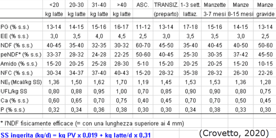 L’asciutta dura 2 mesi, l’assunzione è di 14 kg/ss, all’11% di Proteina grezza PG, amido tra 15-20 %.