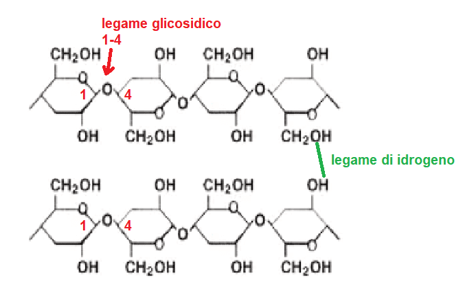 La cellulosa ha la stessa formula bruta dell’amido (C6H10O5)n, le molecole di glucosio sono unite da un legame beta-glicosidico sempre in posizione 1-4.