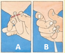 Pollice e indice premono il canale tra cisterna e capezzolo, per evitare il reflusso del latte, e poi con medio anulare e mignolo si preme gradualmente il capezzolo.