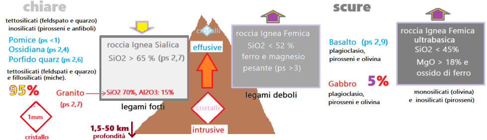 Quanto più la roccia ignea è ricca di silicio, tanto più è chiara: quarzo, ortoclasio, plagioclasio sodico e muscovite; ma quanto più si arricchisce di metalli tanto più diventa scura verde, nera, bruna: pirosseni,