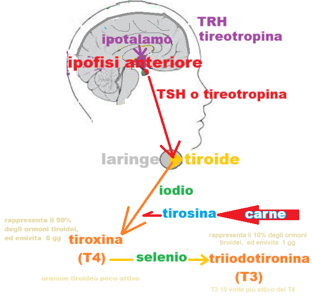 La base di costruzione degli ormoni tiroidei é l’aminoacido tirosina che si trova nella carne. La tirosina è anche precursore di neurotrasmettitori: dopamina e adrenalina, ecco il collegamento tra ipotiroidismo e depressione.