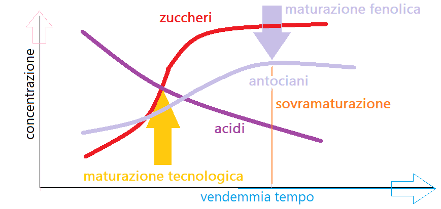 Il momento della maturazione tecnologica garantisce vini ad alta gradazione, invece a maturazione fenolica dà al vino un colore completo e compatto per i fenoli nella buccia e nei vinaccioli degli acini.